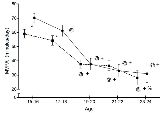 MVPA (in minutes/day) for men (in circles) and women (in squares) Spanish adolescents and young adults during the ages 15–24 (n = 7827). Data are means ± 95% confidence interval (CI). @: Significantly different from the 15–16 year old group. +: Significantly different from the 17–18 year old group. %: Significantly different from the 19–20 year old group. *: Significant differences between genders for a particular age.
