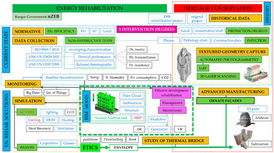 We present an action protocol for the smart energy rehabilitation of historic buildings, based on the work carried out to rehabilitate the Miñones Barracks of Ortuella (Vizcaya). The work was undertaken within the “nZEB, Rehabilitación Inteligente de Edificios Bajo Criterios de Consumo de energía casi Nulo”, (ZEB, Smart Building Rehabilitation under Nearly Zero-Energy Consumption Criteria) strategic initiative [4], promoted by the Department of the Environment, Territorial Planning and Housing of the Basque Government. During the years 2018 and 2019, the building underwent an in-depth analysis, led by the university team—authors of this paper—in order to propose innovative solutions related to energy efficiency and rehabilitation, but also to study, given that it is a classified building, the compatibility between the rehabilitation measures to be applied, and the preservation of the original configuration. These energy improvement solutions are based on non-destructive tests such as infrared thermography, supported by the massive capture of geometries by means of 3D laser scanning [5], and UAV-(Unmanned Aerial Vehicle) assisted automated photogrammetry [6], with the aid of advanced manufacturing using smart and industrialized systems, whose performance will be monitored through measurement instruments, permanently linked to BIM digital models, which will permit preventive and generative maintenance in virtual or augmented environments [7].