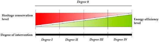 After analyzing many residential buildings, a 5-degree theory was determined for energy intervention in heritage. This theory must cover the entire spectrum of buildings considered to form part of the built heritage, and even those that are not protected, but that may have some value that must be protected. This classification in degrees must contain two basic values to be considered: On the one hand, the degree of building protection value, and on the other, the level of energy improvement that can be reached, bearing in mind the first value. Both values must form part of one single concept. The different degrees are going to be presented, starting with Degree 0, which is the study of the property as it is today, continuing until Degree IV, which would be the case of the most intervened building. Within these degrees, there is a progressive energy efficiency improvement level, and a regressive heritage protection level (Figure 2) [14].