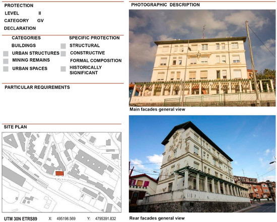 The old Miñones Barracks in Ortuella were constructed in 1902. In 1988, the Integral Rehabilitation Project for the house was drafted on the request of the Department of Urban Development, Housing, and Environment of the Basque Government, with the aim of fitting out 8 public promotion dwellings in the house. During the reform, the four facade walls, of different thicknesses in brick, were cladded with 4 cm plasterboard panels with insulation on the interior. The roof had no insulation, although insulation was placed on the floor of the attic. The original molding still existed on the facades: double imposts marking the stories, and accentuated window ledges. A shield of the Vizcaya Council is located in the center of each one of the four facades, the most important being those situated in the gables. The building has fallen under different forms of protection in recent years (Figure 3). The heritage values used to analyze the assets are the following: no perceivable volumes from the adjacent public space, or associated with it, could be added. The property could be redone, but always maintaining the volume, the dimensions, textures, and colors of the original. The unit, movement, rhythm, scale, symmetry, hierarchy, proportion, color, texture, and balances of the property would be preserved.
