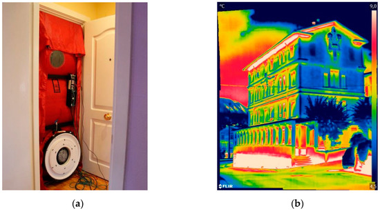 (a) Installation of the fan to test the permeability of the windows; (b) Thermography of the main facade. (Source: LCCE).