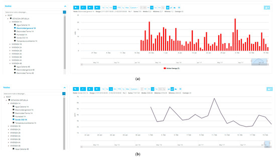 Finally, we conducted a measurement of the general DHW and heating electric consumption. The measurement of the general electricity consumptions of the dwellings was carried out from the datalogger installed in the space reserved for the centralization of the electricity meters. The actual datalogger has open core transformer inputs. To measure the electricity consumption of the heater and the electrical radiators, wireless measuring devices were placed in the sockets that supply them. They communicate with the central controller through a gateway by means of Zigbee protocol.