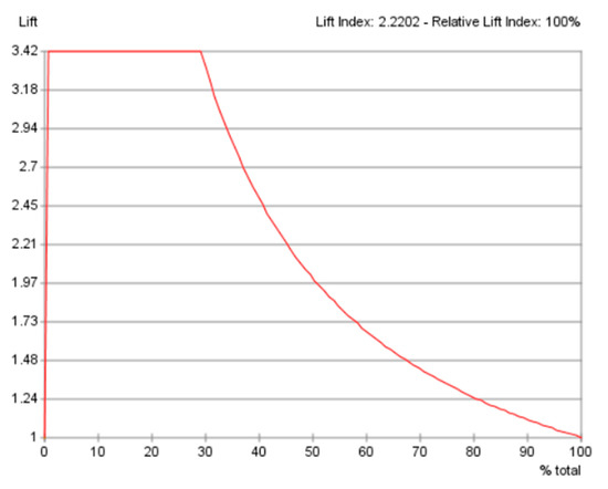 4.4.2. Evaluation of the Predictive Efficacy Using the Gains Curve and the Lift Curve
