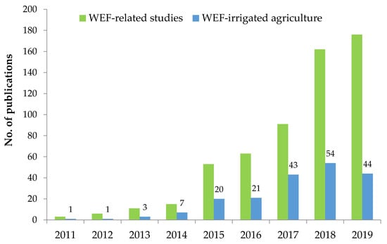The automated database search provided 580 WEF-related papers in total. Of these, 194 articles (approximately one third) addressed irrigated agriculture and were included in the analysis. In the remaining 66% papers, WEF nexus literature covered topics such as the following: the impacts of global climate change on the hydrological cycle, along with WEF nexus; the role of the IWRM approach at the global level and recent discourses around the WEF nexus and the green economy; the potential of hybrid floatovoltaic technology and aquaculture farming applications for improving WEF nexus sustainability; and the development of a systems framework to analyze the WEF nexus from an urban systems perspective. We noticed an annual increase in the number of selected publications during the study period, indicating that researchers were paying growing attention to the nexus approach (Figure 3). WEF-related publications dealing with irrigated agriculture peaked in 2018. In what follows, we exclusively address the WEF publications dealing with irrigated agriculture.