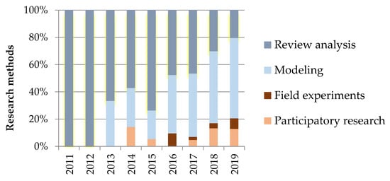 The types of scientific methods used in the WEF nexus papers over time showed that review analyses were dominant in the first years, while modeling approaches emerged in constantly increasing numbers from 2013 onwards (Figure 5). This indicates that the WEF nexus was initially a conceptual approach, with little evidence about its operationalization. During the few last years, papers addressing empirical approaches, including participatory research and field experiments, have emerged in addition to modeling approaches. This follows the suggestion by Leck et al. [42], who reiterated that more sophisticated modeling systems designed to assess and quantify WEF linkage could help in operationalizing the nexus approach. The number of studies employing quantitative modeling approaches increased during the study period. These included a global biosphere management model [43,44], a vadose zone model [45], a hydrological model with a soil and water assessment tool [46], an agent-based model [11], a system-wide economic–water–energy model [41], a WEF Nexus Tool [47], inter alia. Only 8% of the papers employed participatory social science methods, including expert interviews [48], household surveys [49,50] and focus group discussions [51]. This is in line with Hannibal and Portney’s [52] findings that the nexus research, or the connection between water, energy and food, has not been sufficiently addressed in the social sciences. Field experiments were only employed by 4% of the studies, namely, Mortensen et al. [53] on nutrient loops in arid-land rivers, Obade and Lal [54] on soil quality assessment, and Tran et al. [55] on the suitability of a sulfur-based seed solution in the development of WEF nexus technology using sulfur chemicals that contain an air pollutant. These results prove that the WEF concept is starting to be operationalized in research. However, the low number of empirical studies compared to modeling activities reveals the risk of data scarcity in the proper ground-truthing of conceptual and modeling work.