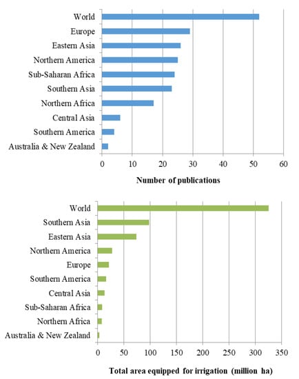 Regarding the geographic scope, approximately 27% of the articles take a global perspective (Figure 6). This is because approximately 40% of the publications carried out review analysis. In terms of specific countries or regions, Europe was mostly addressed (about 15% of publications), followed by eastern Asia (13% of publications). This is in line with the large area of irrigated agriculture in this region. Eastern Asia occupies 73.9 million ha or about 23% of the world’s total irrigated lands [56]. Two thirds of these publications are implemented in China only. North America (Canada and the United States) is the next region where the WEF nexus concept has been important research (12% of publications). Despite the fact that southern Asia (e.g., Bangladesh, India, Nepal, Pakistan and Sri Lanka) has the largest irrigated land area (98 million ha), only approximately 11% (or 23 papers) apply the concept of WEF nexus to this region. In contrast, many WEF nexus-related publications exist in Sub-Saharan Africa (approximately 12%), despite this region having a relatively small proportion of irrigated land area (8.2 million ha). This shows that the published WEF nexus papers relevant to irrigated agriculture are disproportionally represented with regard to total irrigated areas. Despite the fact that central Asia and southern America have relatively larger total irrigated areas, the papers on WEF nexus addressing irrigated agriculture underrepresent these geographical groups.