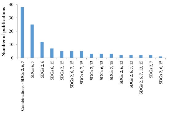 We used the SDGs’ classifications to analyze the thematic perspectives of the papers (Figure 7). SDGs 2, 6 and 7 provide the core narratives for the food, water and energy themes, respectively. In addition, while reviewing the papers we found that SDGs 13 and 15 were also addressed as important themes for the WEF nexus analysis related to irrigated agriculture. We looked at all combinations of different SDGs. The results indicate that even though the papers used WEF nexus terms in their titles, abstracts or keywords, the detailed review of the abstract and, in some cases, the whole paper indicated its poor linkage to all WEF sectors. The approach of WEF nexus literature to realizing a number of SDGs show that a comprehensive approach to all three sectors was implemented in only 20% of the papers. Meanwhile, 13% of papers put emphasis on covering the complex themes of sustainable water resource management (SDG 6) and access to affordable, reliable and sustainable energy (SDG 7). Approximately 6% of papers discuss food security, sustainable agriculture (SDG 2) and SDG 6 in the context of WEF nexus in irrigated agriculture. Two papers analyzed WEF nexus from an integrated management perspective, touching upon aspects of all five SDGs. For instance, the paper by Olsson et al. [57] suggested a novel model for analyzing carbon sequestration activities in dry land agriculture, considering the water–food–energy–climate nexus. Using a grasslands example in China, the authors concluded that the economic water productivity of grassland restoration was low, and that there was a need to include several of the other co-benefits to justify the use of water for climate change mitigation. Those co-benefits included climate change mitigation, water availability, downstream water impact, energy security, food security and moisture recycling [57].