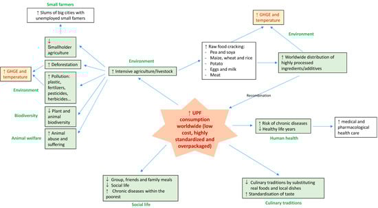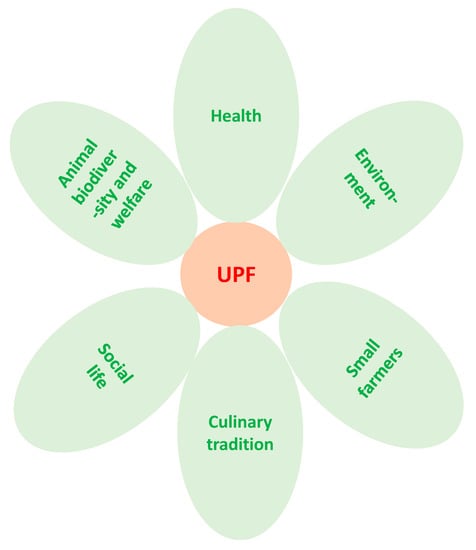 Since 2011, at least 260 peer-reviewed papers have used the UPF concept, as defined in the NOVA classification [] (searched for “UPF” in the article title in the ISI Web of Science on 9 May 2020). A main finding is that the high and/or regular consumption of UPFs has been consistently associated with a higher prevalence of the main chronic diseases and metabolic deregulations in more than thirty-five ecological, epidemiological, and interventional human studies [] from several different countries, indicating a globalization of UPF consumption. These studies focused on deleterious links with health, while the Brazilian Dietary Guidelines suggested that the massive consumption of UPFs may also be associated with an increased degradation of culinary traditions, social life, and the environment [], thus affecting several dimensions of the sustainability of the food system itself. However, these suggestions need to be checked further and supported by data from original scientific papers.