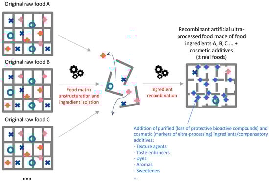 Schematic representation of UPFs through fractionation of original raw foods and ingredient recombination with ‘cosmetic’ additives. Figure was originally supplied by the Siga Society©.