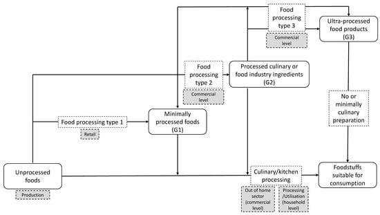 Concerning more specifically the impact of UPFs on the environment, the Brazilian Dietary Guidelines (2014) intuitively conclude that UPFs can impact the sustained survival of the planet []. Based on the first version of the NOVA classification (in three technological groups) [], Keding et al. schematized three types of food processing within the food system []. From this description (Figure 3), it appears that the processing underlying UPFs involves more processing steps, more packaging, and longer transport distances.