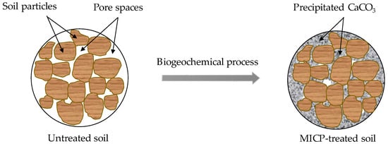 Microbial-induced calcite precipitation (MICP) uses naturally occurring bacteria to bind soil particles together through calcium carbonate (CaCO3) precipitation as shown in Figure 1, thereby increasing the strength. The expected life of MICP-treated soil is more than 50 years, which is compatible with the expected service life of many geotechnical structures [1]. Therefore, biogeochemical processes in MICP offer the potential for solving many engineering issues related to ground improvement. MICP also offers advantages over other common approaches as it uses natural processes and it has the potential of being a comparatively inexpensive technique. The effectiveness of MICP in cementing soil depends on the types of bacteria used, the methods of growing these to the required concentration, the pH and temperature during urea hydrolysis, the concentration and flow rate of cementation solution (e.g., calcium concentration and input flow rate), the soil properties (e.g., the availability of nucleation sites, degree of saturation, soil gradation, particle size, pore throat size) and so forth [2,3,4,5,6]. It is noteworthy to report that there are a number of review articles published in the past focusing on a particular aspect of MICP, e.g., optimizing protocols [7], mitigating liquefaction [8,9], stabilization [7,9,10,11], construction [12] and other aspects [13,14,15,16,17,18,19,20]. A comprehensive review of the current state of knowledge on overall MICP processes, application and sustainability has not yet been undertaken. Therefore, this article presents a comprehensive review of overall MICP processes including the historical development of the technique, reactions and biological sources involved, optimization of the process, the behaviour of MICP-treated soils, modelling of improved soil (including empirical, constitutive and discrete element method models) for geotechnical engineering applications, various application areas, together with a quantitative assessment of associated costs as well as energy and CO2 footprints (for three hypothetical construction scenarios).