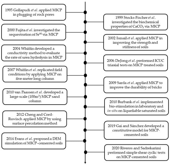 The significant contributions towards the development of MICP techniques are presented in Figure 2 in chronological order. Arguably, MICP was first applied for geotechnical applications in 1995 by Gollapudi et al. [21] for controlling leaching of groundwater contaminants in highly permeable channels by packing a mixture of bacteria (Bacillus pasteurii) with sand. Note Bacillus pasteurii is an outmoded taxonomic name for Sporosarcina pasteurii, which is a gram positive bacterium with the ability to precipitate calcite. Gollapudi et al. [21] observed a maximum of 75% reduction in permeability, which was achieved after 95 h. Stocks-Fischer et al. [22] further investigated the physical and biochemical properties of CaCO3 precipitation via MICP using B. pasteurii. They observed that the microorganisms used in the MICP process create an alkaline environment and provide nucleation sites favourable for CaCO3 precipitation. They hypothesized that, at high biomass concentrations, the rate of CaCO3 precipitation decreases possibly due to accumulation of calcium ions (Ca2+) over the surface of the bacteria cells. Later, Fujita et al. [23], while studying the application of MICP as a remediation technique for divalent radionuclides and other contaminants, e.g., strontium90 (90Sr2+) in groundwater, suggested that the rate of CaCO3 precipitation is directly related to the rate of urea hydrolysis in an alkaline environment. MICP was also used by Hammes et al. [2] to facilitate the removal of soluble calcium (Ca2+) from industrial wastewater as an alternative to the use of Na2CO3. Their results showed that about 85–90% of Ca2+ was removed by using 8.3 mM of urea.
