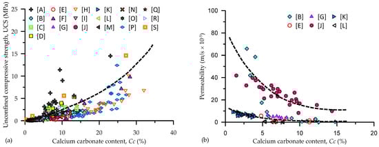 Figure 5b shows a plot of permeability against Cc for data compiled from the literature. The permeability of MICP-treated soils ranges from 0.01 to 66 (m/s × 10−5) with Cc ranging from 0.002 to 14.8%. The permeability of MICP-treated soil decreases exponentially with the increase of Cc (Figure 5b), possibly due to the reduction in void spaces by the precipitated CaCO3. Again, the trend of the data as shown in Figure 5b displays some degree of variation (less than that observed for UCS), possibly due to the influential factors discussed earlier.
