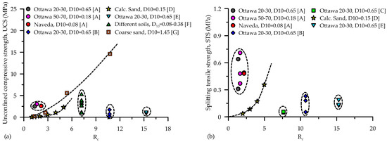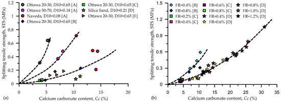 In Figure 6b, STS was plotted against CC for different fibre contents. A good correlation was observed between STS and CC, with two distinct trends. This is an indication that both Cc and the fibre content have a combined effect on the STS of MICP-treated soils. For example, considering similar soil types (same D10) and fibre content, a slight variation in STS was observed possibly due to differences in CC.