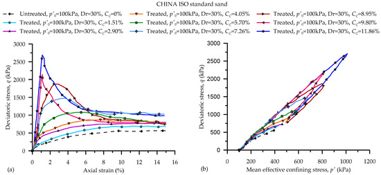 Undrained behaviour of untreated and MICP-treated CHINA ISO standard sand: (a) stress-strain paths, (b) paths (data sourced from [105]).