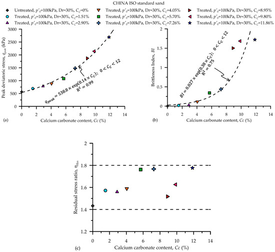 It is worth noting that the undrained triaxial behaviour of both MICP-treated and untreated soils, as shown in Figure 7, were for the same initial and Dr. Therefore, the difference in behaviour was due to the difference in their CC. MICP-treated soils with high CC exhibited higher strength (peak deviatoric stress, ). For example, the MICP-treated specimen (with CC = 11.86%) exhibited approximately five times higher strength compared to the untreated soil (Figure 7a). Also, the specimen with CC exhibited higher brittleness compared to the ductile nature of low cemented MICP-treated soils [3,28,105]. Therefore, a further detailed analysis was performed to correlate CC with other index properties such as the brittleness index (BI), peak deviatoric stress () and residual stress ratio () at the end of the tests.