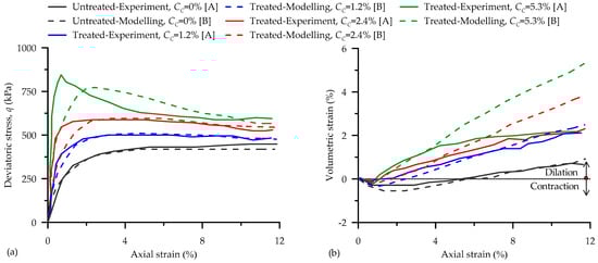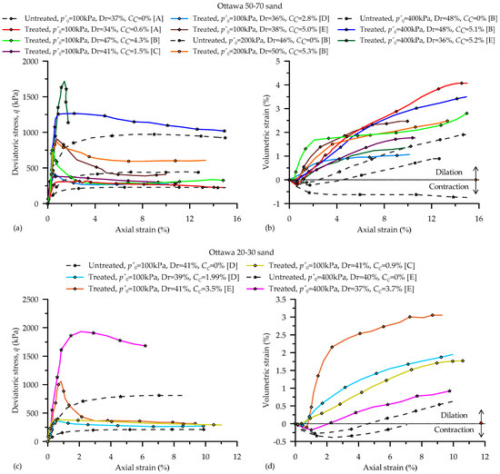 Plots of volumetric and axial strain for Ottawa 50–70 and 20–30 are presented in Figure 9b,d, respectively. For the same , the volumetric strain response was found to be more dilative for MICP-treated soils compared to the untreated sand. For example, the MICP-treated soils exhibit less contraction (with no contraction observed in some cases) at small axial strains (less than 3%) followed by more dilation at large axial strains compared to the untreated sand specimen. Similar to the observed behaviour in the stress-strain plot, the dilative behaviour of the MICP-treated soils increased with increasing CC.