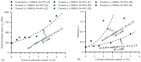 To quantitatively assess the influence of CC on the drained shear strength behaviour of MICP-treated Ottawa sand, was obtained from Figure 9 and plotted with CC in Figure 10a. Similar to the results for undrained behaviour, increases exponentially with CC as shown in Figure 10a with an R2 value of 0.99. The dilatancy (d), which is defined as the rate of plastic volume change () with the plastic deviatoric strain (), is an important characteristic behaviour of drained soil [114,115,116] and has been used in prediction/constitutive modelling of soil behaviour [117,118]. The dilatancy (d) can be calculated using Equation (8). Soil and slightly cemented/treated soil exhibit negligible elastic behaviour under large strain; therefore, the total volumetric and deviatoric strains were assumed to be plastic [117,119].
