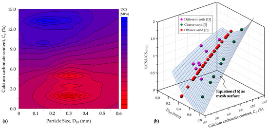 Several empirical relationships or equations have been proposed to correlate UCS with CC. For example, Harkes et al. [120] developed the following relationship (Equation (9)) for MICP-treated Itterbeck fine sand (D50 = 0.17) to correlate UCS with CC (R2 = 0.91). However, there were inconsistencies with the physical meaning of the equation terms. For example, at 0% CC, the equation gives a UCS value of 128.11kPa, which is not true for coarse-grained soils such as sands.