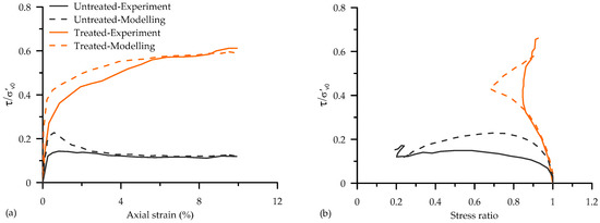 In general, the behaviour of MICP-treated soils is affected by the initial relative density (Dr), confinement () and cementation levels in term of CC. Figure 7 compares typical undrained shearing responses of MICP-treated and untreated sandy soils. At a constant = 100 kPa and Dr, the MICP-treated soils under undrained shearing show breakage of bonds (brittleness) at different axial strains (Figure 7a). The MICP-treated soils also exhibit higher peak and residual strengths and increased initial shear stiffness compared to the untreated state when plotted in – space (Figure 7b).