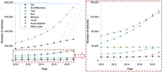 The total registered traffic data for each year was collected from the Bangladesh Road Transport Authority [61], which predicted the vehicle-specific growth patterns for the city (Figure 2). In case of future scenario analysis, the growth trend was considered to predict the vehicle numbers for the scenario.