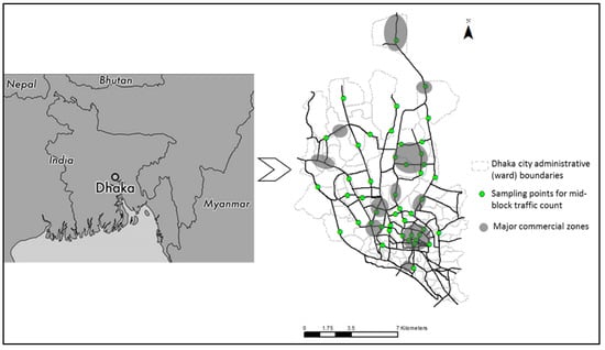 Dhaka, the capital city of Bangladesh, has a quite widespread road network with several major road links supporting mobility (Figure 2). As the city is extended more in north–south directions, the north–south–north flow of vehicles along the arterial links supporting the commercial hotspots at the north, south, and middle (shaded areas in Figure 2) parts, would be significant for pollution levels in the city. The flow and characteristics of vehicles differ significantly on the functionality of the zones, and thus the pollution concentration would vary spatially.