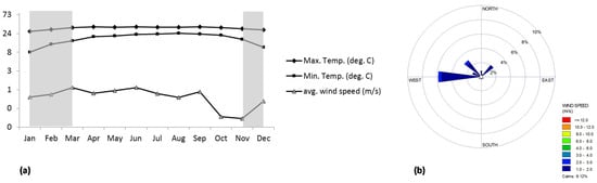 Figure 3. Meteorological data for Dhaka (a) monthly average temperature and wind speed (b) wind direction for December (data source: Bangladesh Meteorological Department [86]). - ○