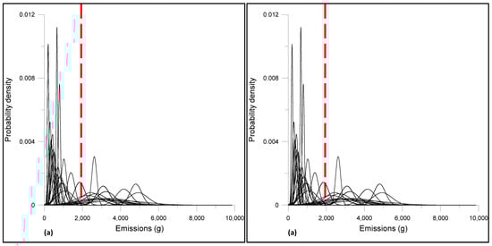 As outlined in methodology, the normal distribution and the cumulative distribution of PM2.5 emissions for each road link (46 road links) was obtained; the result for 2019 is portrayed in Figure 6. The distribution result shows that in the majority of cases higher probability would be around mean emissions, as is indicated by the peakedness of the curves (Figure 6a). As per the cumulative distribution of the emissions, a significant number of the roads (around 35%) would be susceptible to a higher probability of exceeding the threshold level (Figure 6b).
