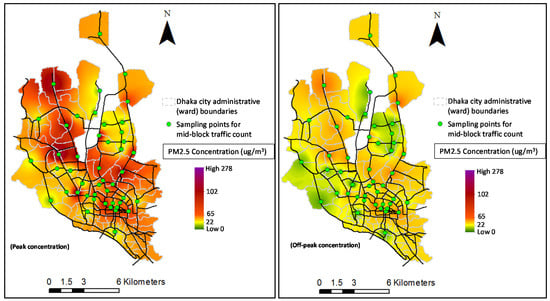 The risks of being exposed to an unhealthy air quality depend on the concentration prevailing, and therefore the PM2.5 concentration contributed from the vehicular sources was estimated. By interpolating the concentrations estimated at 46 points (locations) in the city, a spatial distribution map of PM2.5 concentrations (1-hr average) for the city was generated for both peak and off-peak periods (Figure 7). The magnitudes of concentrations were categorized according to the concentrations corresponding to AQI levels as per Bangladesh national standard (Figure 7).