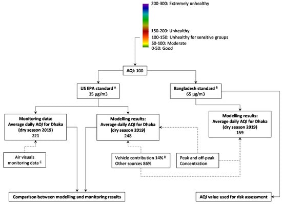 A schematic diagram showing the comparison between modelling and monitoring results for 2019. Source: A US EPA [59]; B Department of Environment [58]; C AirVisuals [2]; D Begum and Hopke [27].