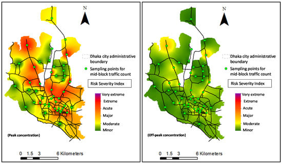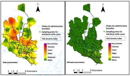 The risk intensity map of PM2.5 emissions from vehicular sources for peak and off-peak periods for the 2024 scenario: “business-as-usual”.