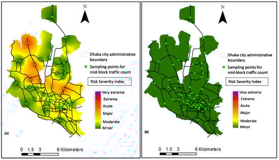 The risk intensity map of PM2.5 emissions from vehicular sources for peak periods for the 2024 scenarios: (a) modified “business-as-usual” scenario by integrating proposed new euro standards, (b) further enhancement of the modified ‘business-as-usual’ scenario when vehicle speed increases with the implementation of MRT-BRT.