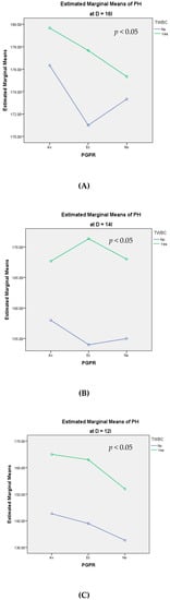 Interaction graph of plant-growth-promoting rhizobacteria (PGPR) and TWBC at 16 (A), 14 (B) and 12 (C) number of irrigation (I) for maize plant height (PH), where D represents drought levels.