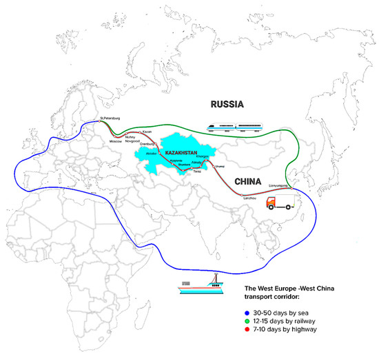- Western Europe—Western China Transit Corridor Economic and Social Effects of the Project|3aпaднaя Евpoпa—3aпaдный Китaй Meждунapoдный Tpaнзитный кopидop. Available online: https://europe-china.kz/en (accessed on 13 June 2020).