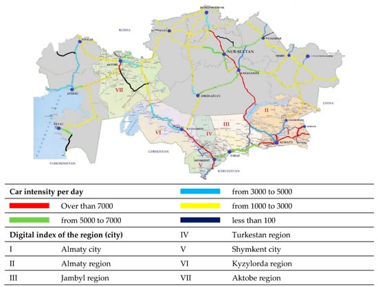 - On Approval of the Program of Transport Infrastructure Development in the Republic of Kazakhstan. Available online: http://www.kazcargo.kz/en/o_kompanii/zakonodatel_stvo/o_transportnoj_strategii_respubliki_kazahstan_do_2015_goda/ (accessed on 13 June 2020).