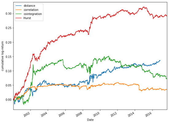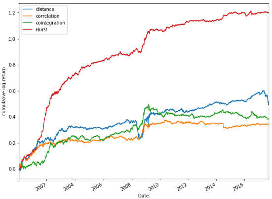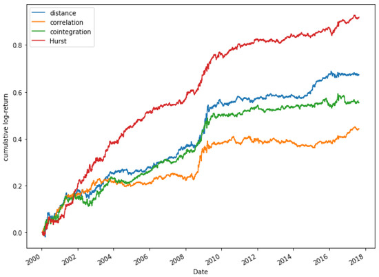 Financial literature has introduced different methodologies for pair selection. Important contributions are the distance method [52], those based on correlation [53] and cointegration [54], the copula method [55] or Hurst exponent based method [56,57].
