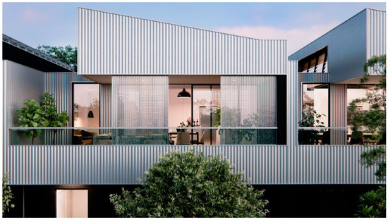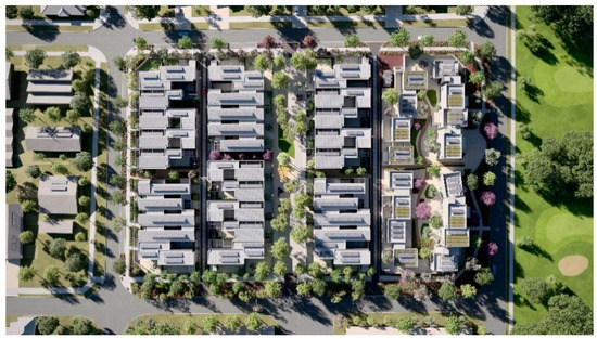 A Fremantle-based architectural company designed the homes, undertook the site planning and obtained development approval for the 36 townhouses as part of the survey strata subdivision. It is important to note that in Western Australia, for a survey strata subdivision, the built form is generally required to be resolved at the stage of subdivision application, which is not usually required for a “green title” (freehold) subdivision. The architecture leverages learnings from a nearby development that embraced compact, efficient urban design [45]; however, a unique theme developed by the architects involved utilizing alternative materials and colour schemes in a bid to respond to the built form character requirements of the local precinct, which has a mixed-use and industrial warehouse vernacular. The townhouses have been designed to be climate responsive and incorporate integrated renewable energy and local-scale water systems. Public and private greenspaces are linked to provide open space, shade and connectivity.