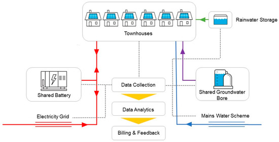 House meters include bi-directional energy meters on the main house electrical supply connection as well as meters on the PV system to capture solar generation. The bi-directional meters will enable the tracking of the importing and exporting of electricity between each townhouse and the shared battery, with this process, and the associated debits and credits undertaken by the battery owner–operator using a blockchain platform [33,60]. Water meters installed on the mains water and strata groundwater bore connection to each house enable the proportionate billing of households for their water use by the strata company. Rainwater meters have been installed to understand the impact of this source in reducing mains water reliance.