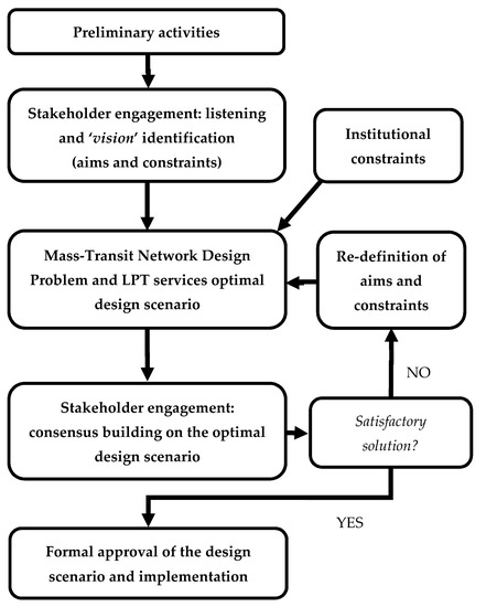 Starting from these considerations, the thesis discussed in this paper is that the (rational) decision-making process followed to design transportation solutions is itself a key element of sustainability, because it can influence its achievement (success or failure of the planning process). Precisely, the aim and the main originality of this paper has been to propose an innovative decision-making methodology for designing local public transport services based on a rational process with stakeholder engagement, aiming to perform a sustainable development perspective. The traditional approach based on the formulation of a mathematical optimisation problem was combined with stakeholder engagement to identify a technically feasible design solution. The proposed methodology is based on a cyclic framework where stakeholder approval and plan proposals interact until an agreed solution is identified.