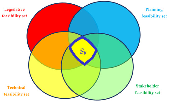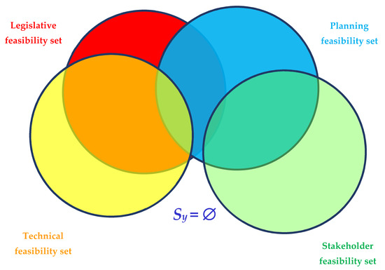 However, in some conditions, the intersection may generate an empty set, that is Sy = ∅, as shown in Figure 3. In this case, assuming that the technical constraints are not removable, hence that it is not possible to modify ST, that the legal constraints cannot be removed either (set SL), and planning constraints are difficult to change (set SP), it is crucial to interact with stakeholders and make them change their positions to generate a non-empty feasibility set. In this case, the solution will probably be closer to stakeholder requirements, and sub-optimal from the technical point of view. However, if technicians and stakeholders do not allow any feasible solution to be identified, it is necessary to interact with the planning process.