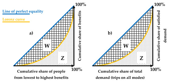 Therefore, we believe that equity should be assessed with the OD pairs served and the demand between the same OD pairs; this approach to evaluating equity is, to our best knowledge, original. The proposed procedure is based on the well-known Gini index [55], suitably adapted to the evaluation of the OD pairs served. This index varies from 0 (perfect equality) to 1 (maximal inequality) and is calculated as the ratio between areas W and W + Z in Figure 4a, where the Lorenz curve expresses the proportion between the cumulative share of the benefit and the cumulative share of people that enjoy the corresponding value of the benefit; it is also equal to 2 W (or 1 – 2 Z). The proposed approach considers travellers on all modes as the subjects who can benefit from the resources, and the demand served by LPT as the benefits of the intervention. Consequently, the Gini index is calculated as usual, only modifying the elements to be reported on the axes of the graph (see Figure 4b). Section 4 will report the results for the case study.