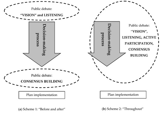 The complexity of decision-making processes in transportation has long been recognised in the transportation planning literature, together with the need to ‘open’ them up and broaden the consensus around alternative courses of action (e.g., [15], or recently [16]). However, most of the contributions in the transportation literature (e.g., [17,18,19,20]) adopt an engineering or economic perspective. For example, Ref. [17] proposes a two-dimension approach for including activity location analysis in the transportation planning processes; Ref. [18] provides a great emphasis on which activities and what actors may influence the quality of the planning process and its related impacts on the society; Ref. [19] proposes a system of models and algorithm for simulating, designing, and planning transportation systems; Ref. [20] represents a complete collection of model and techniques for analysing transportation systems.