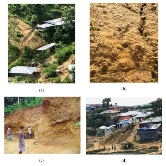 (a) Houses along highly susceptible hills in Rangamati; (b) loose soil structure in Rangamati; (c) Continuous illegal hill cutting in Chittagong; and (d) houses in Rohingya refugee camp in Cox’s Bazar, Bangladesh.