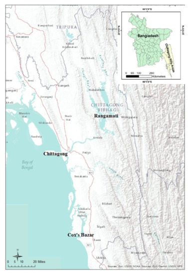 The location of southeast Bangladesh. Field study districts include Rangamati, Chittagong and Cox’s Bazar.