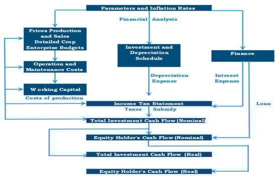 All of the above have been prepared in real and nominal prices, followed by the preparing of the cash flows from a total investment point of view, both nominal and real. The economic indicators of inflation, exchange rates, import/export duties, and export support programs were collected from relevant national and international sources. Detailed cash enterprise budgets with and without the intervention were collected through intensive interviews and focus group assessments in the target production areas in Upper Egypt (Luxor, Sohag, Qena, and Aswan); interviews were conducted with farmer organizations; produce value chain actors; HEIA members; and the United Nations International Trade Statistics Database (COMTRADE) [14] (Free On Board (FOB) prices). Figure 1 and Figure 2 show the methodology that has been used for the financial and economic analysis in order to define the content of the CBA schematically represented. Figure 1 describes the financial modeling of proposed interventions for the targeted value chains’ financial and economic viability. Detailed crop enterprise budgets and macroeconomic parameters (Figure 1) are used to construct the working schematic. These parameters include inflation index, revenue prices, production and revenue, direct operational costs, working capital, loans and interest expense, and investment costs. These are subject to the income tax and tax subsidy prepared in nominal and real prices after the cash flows have been prepared—the real and the nominal total investment point of view—to obtain the real and the nominal equity holder’s cash flow.