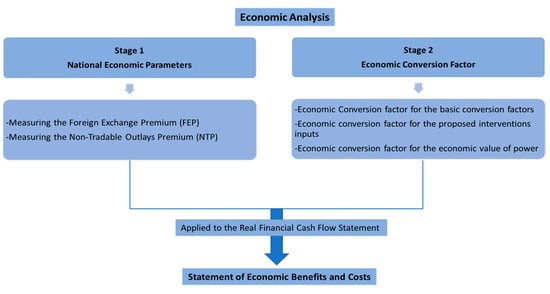 For the working capital, 30 days coverage (the turnover coefficient is equal to 12) is assumed for inventory, cash in hand, accounts receivable, and accounts payable. The Government of Egypt (GOE) provides 8–9% export support, and a 10% sales tax is assumed whenever applicable. The economic analysis followed the standard methodology as in Figure 2. The economic analysis can be estimated through two-stage estimation processes. The first stage consists of measuring the foreign exchange premium (FEP) and the non-tradable outlays premium (NTP). The FEP and NTP depend on a variety of variables, including Egyptian imports, Egyptian exports, indirect taxes, export and production subsidies, export incentives, and other inequalities of the country’s external trade. Together with the economic discount rate, these variables are the main national parameters required to complete an accurate and consistent economic analysis of investment interventions (Figure 2). The economic conversion factors are estimated in a second stage for the basic conversion factors, the proposed interventions inputs (e.g., operation cost, skilled and unskilled labor, and working capital), and the economic value of power.