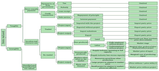 Financial prices for costs and benefits are converted into economic values, and they are adjusted to reflect the social values for the inputs and outputs of the interventions. The economic values have been calculated according to the decision tree shown in Figure 3. This figure describes the two approaches used to determine the economic values. The first methodology is conducted assuming the economic values using the shadow price of foreign exchange; the value of traded goods is increased by the shadow price, which allows for the premium on foreign exchange resulting from distortions. The other methodology describes the shift in opportunity costs of real national income, which are converted from foreign exchange and using a conversion factor to the opportunity value cost in the use of non-traded goods. The financial prices of tangible goods are modified in three successive steps to reflect economic values: (1) Shift of the direct transfer payments; (2) shift of the price distortions in traded items; and (3) shift of the price distortions in non-traded goods and products.