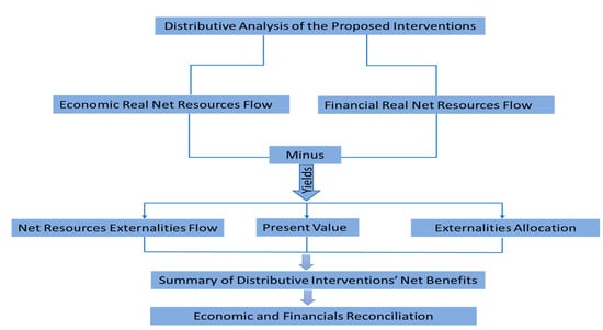 A distributive analysis of the project is conducted following five distinct steps indicated in Figure 4: Identify the externalities and measure the net impact of the externalities in each market as the real economic values of resource flows less the real financial values of resource flow; measure the values of the various externalities throughout the analysis period and calculate their present values using the economic opportunity cost of capital; allocate the externalities across the various stakeholders of the project; summarize the distribution of the project’s externalities and net benefits according to the key stakeholders and actors in the target value chain; reconcile the economic and financial resource flow statements with the distributional impacts. Reconciliation of the economic externalities is determined by the following structure: