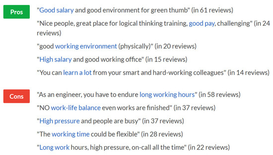 In addition, when submitting a company review, employees are asked to post their opinion on some of the best reasons to work for their employer (pros), any downsides (cons), and a title for the review that is displayed on the site and are encouraged to provide advice to management, limited to 5000 characters in English [41]. Glassdoor displays the five most popular pros and cons for public review, as shown in Figure 2. We scraped the keywords of the five pros and cons for this study to address Q4.