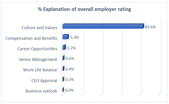 The results in Figure 3 indicate that the overall employer rating of the Fortune 500 company list through crowdsourcing on Glassdoor was primarily determined by the culture and values perceived by internal employees, and the other attributes of employer branding were minor or insignificant to the overall satisfaction of the EVPs perceived by the Fortune 500 companies’ current and former employees. In other words, the different EVPs prioritize employer branding, and Hypothesis 2 was thus supported.